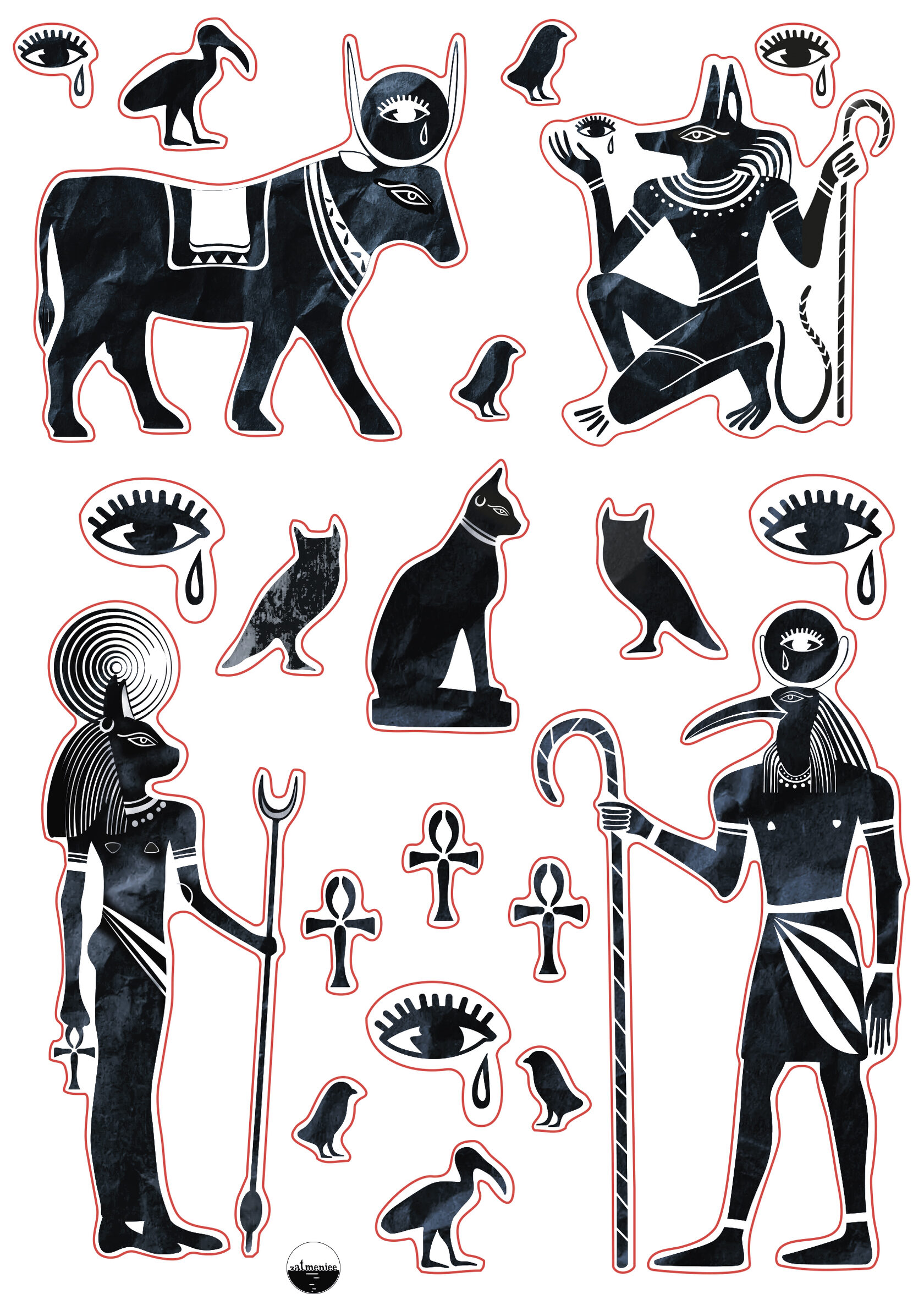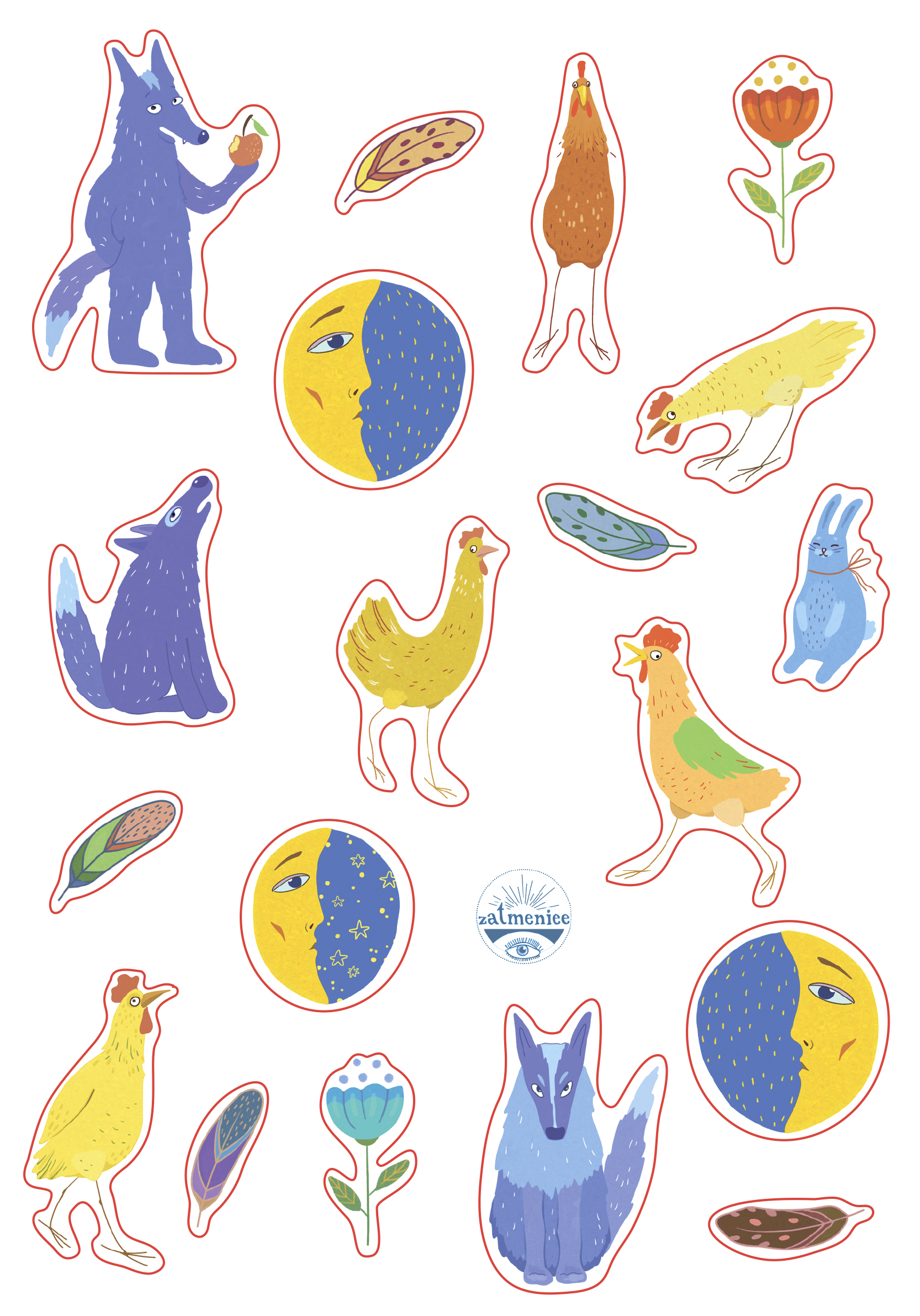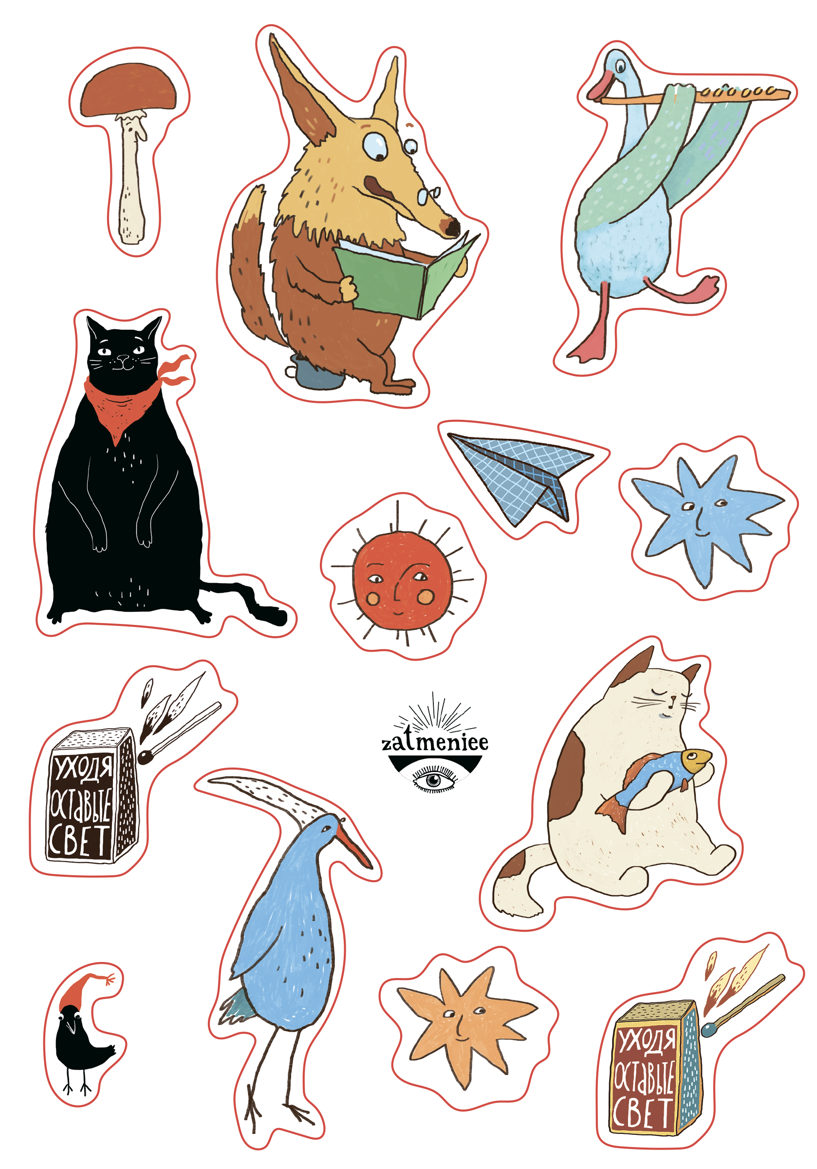 A series of postcards about bulls and cows in winter. Coloring book style.